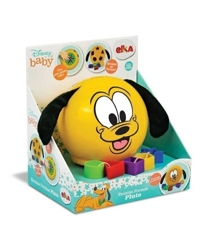 Pluto em formato de bola, com orelha em tecido. Ao tocar ela faz barulhinho de amassado. Encaixe as 5 formas geométricas, associando as formas e tire pelo fundo do pluto. Fundo, passa mão com material macio. Brinquedo que estimula o sentido da criança.